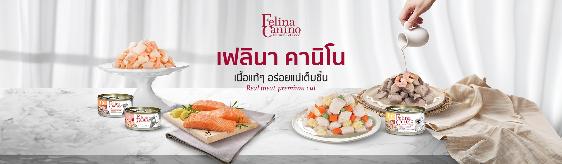 เฟลินา คานิโน มาในรูปแบบอาหารเปียกเพื่อสุนัขและแมว ผลิตมาจากวัตถุดิบเกรดพรีเมียม ไม่มีการใช้เศษเนื้อจากกระบวนการผลิตอื่น (byproduct) ดังนั้นจึงมั่นใจได้เลยว่าสุนัขและแมวของคุณจะได้กินอาหารที่มีคุณภาพแบบเนื้อเป็นชิ้น เต็ม ๆ คำ